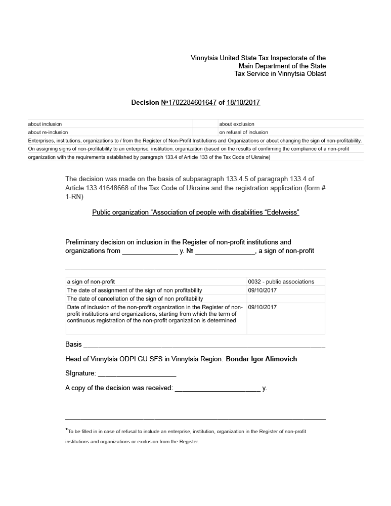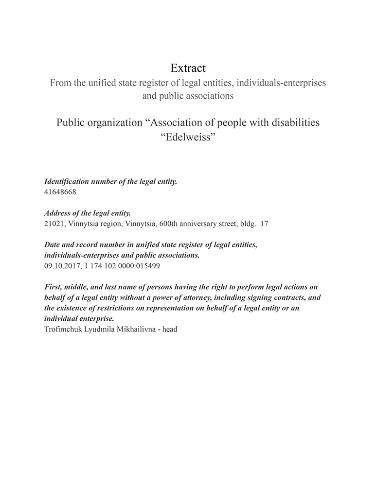 NOR GOVERMENT ORGANIZATION “ASSOCIATION OF DISABLED PERSONS EDELWEISS” |